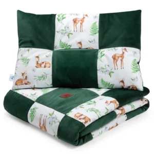 Vyrobena z jemné bavlny a měkkého velvetu, deka s polštářem poskytuje dítěti maximální pohodlí. Výplň z antialergických vláken je bezpečná pro citlivou pokožku dítěte. Náš set se postará o optimální regulaci teploty, což z něj činí ideální volbu po celý rok – jak pro teplejší, tak chladnější noci.