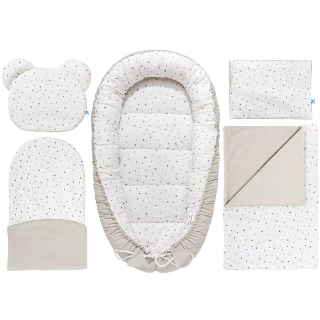 Vyrobená z jemného a prodyšného bavlněného mušelínu, tato sada poskytuje pohodlí a bezpečí již od prvních dnů života dítěte. Sada obsahuje kokon, zavinovačku, dva polštářky, deku a oboustrannou matraci do kokonu, vše navrženo s ohledem na pohodlí a bezpečí dítěte.