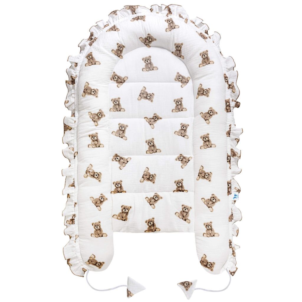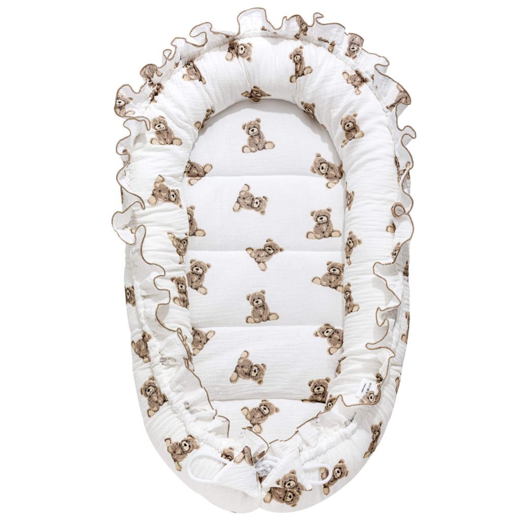 Kokon (95×55 cm): Vybaven vysokými boky (12 cm) pro maximální bezpečnost. Vyroben z prémiového mušelínu, 100% bavlna, vyplněný antialergickým silikonovým vláknem, které je měkké a jemné na dětskou pokožku.