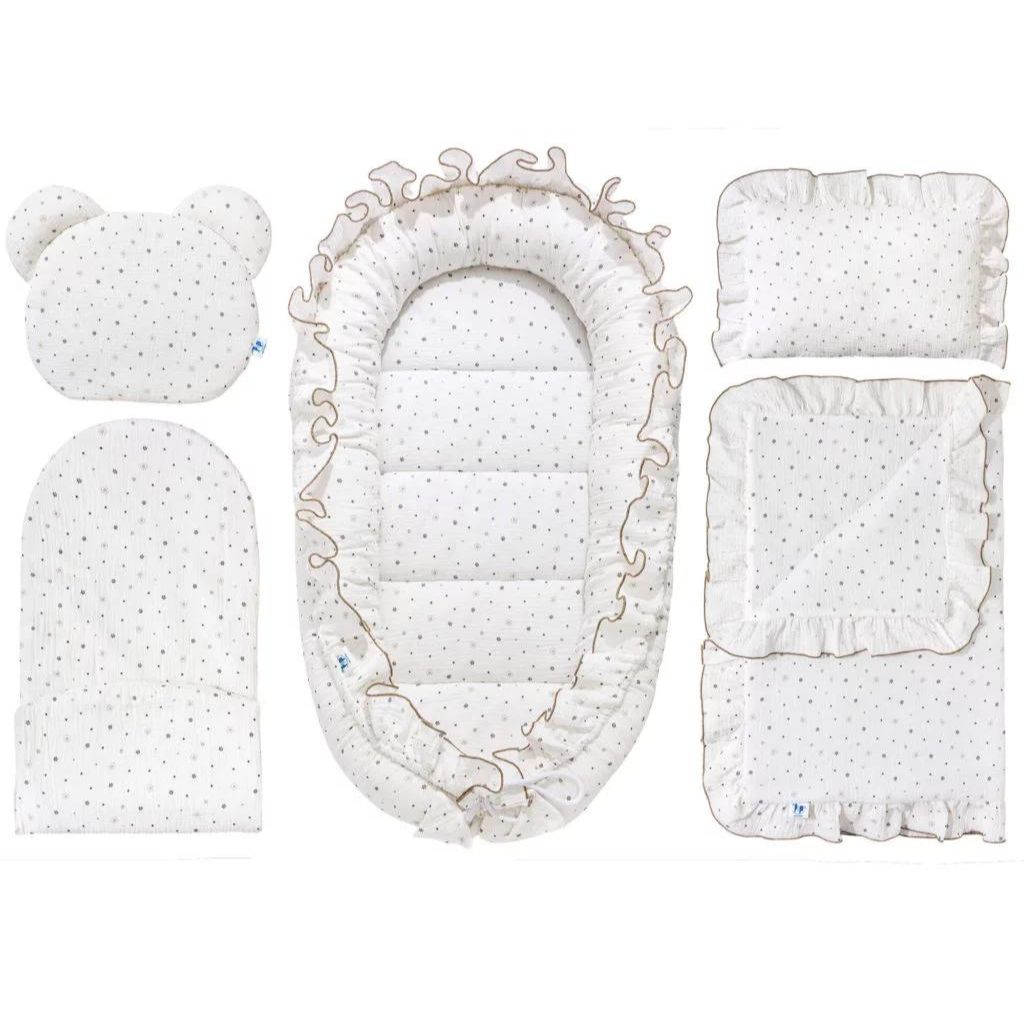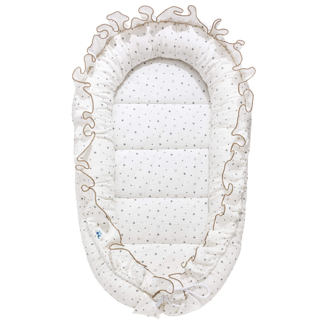 Kokon (95×55 cm): Vybaven vysokými boky (12 cm) pro maximální bezpečnost. Vyroben z prémiového mušelínu, 100% bavlna, vyplněný antialergickým silikonovým vláknem, které je měkké a jemné na dětskou pokožku.