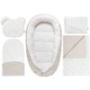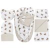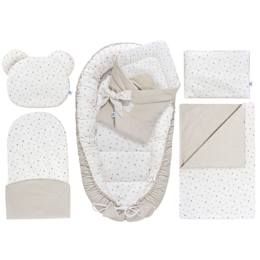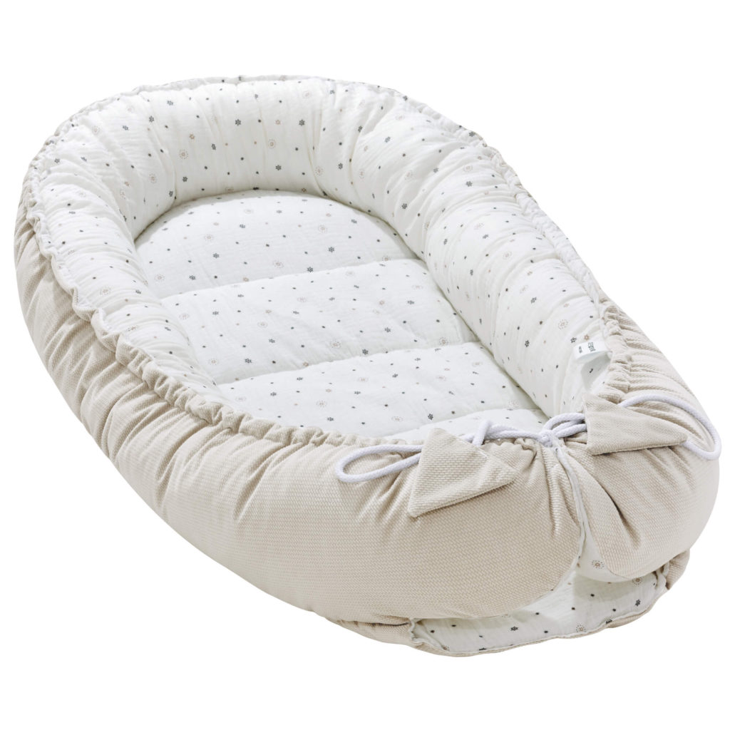 Kokon (95×55 cm): Vybaven vysokými boky (12 cm) pro maximální bezpečnost. Vyroben z prémiového mušelínu, 100% bavlna, vyplněný antialergickým silikonovým vláknem, které je měkké a jemné na dětskou pokožku.