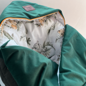 Univerzální velikost deky a strategicky rozmístěné otvory na pásy zajišťují, že perfektně padne do většiny autosedaček, sportovních kočárků a nosítek. Pevné zapínání na suchý zip umožňuje snadné nastavení, a barevné lemování na kapuci dodává půvab a stabilitu.