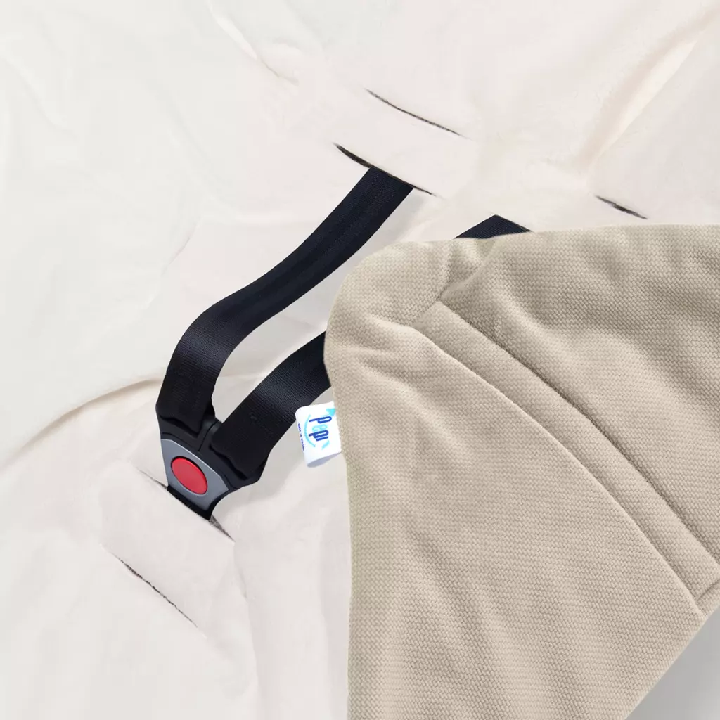 Je vybaven funkčními otvory, které umožňují bezpečné připoutání dítěte jak v tříbodových, tak v pětibodových bezpečnostních pásech. Hypoalergenní výplň ze silikonového vlákna se stará nejen o správnou teplotu, ale také minimalizuje riziko alergií.