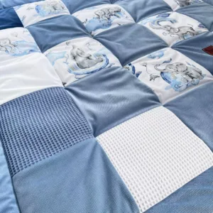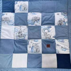 Podložka je vyrobena z různých látek s zajímavou strukturou a jemnými odstíny modré barvy, které stimulují dětské smysly a podporují objevování. Roztomilá slůňata a motivy obláčků vytvářejí příjemnou a klidnou atmosféru v dětském pokoji.