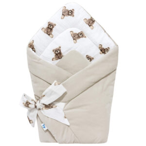 Zavinovačka se snadno přizpůsobí velikosti dítěte pomocí šňůrek, což zaručuje regulaci stupně zavinutí. Toto bezpečné a pohodlné zapínání eliminuje tvrdou sponu nebo suchý zip, které by mohly podráždit jemnou pokožku dítěte. Navíc zavinovačka usnadňuje krmení a nošení miminka, a po rozepnutí může sloužit jako dečka nebo hrací podložka.