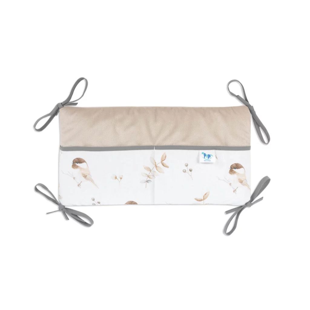 Náš organizér je vybaven pěti kapsami, které jsou navíc zesíleny ozdobnou lemovkou. Má také dostatečně dlouhé šňůrky, které umožňují stabilní připevnění k postýlce. Výplň tvoří měkké, antialergické vlákno a je vyroben z nejkvalitnější bavlny.