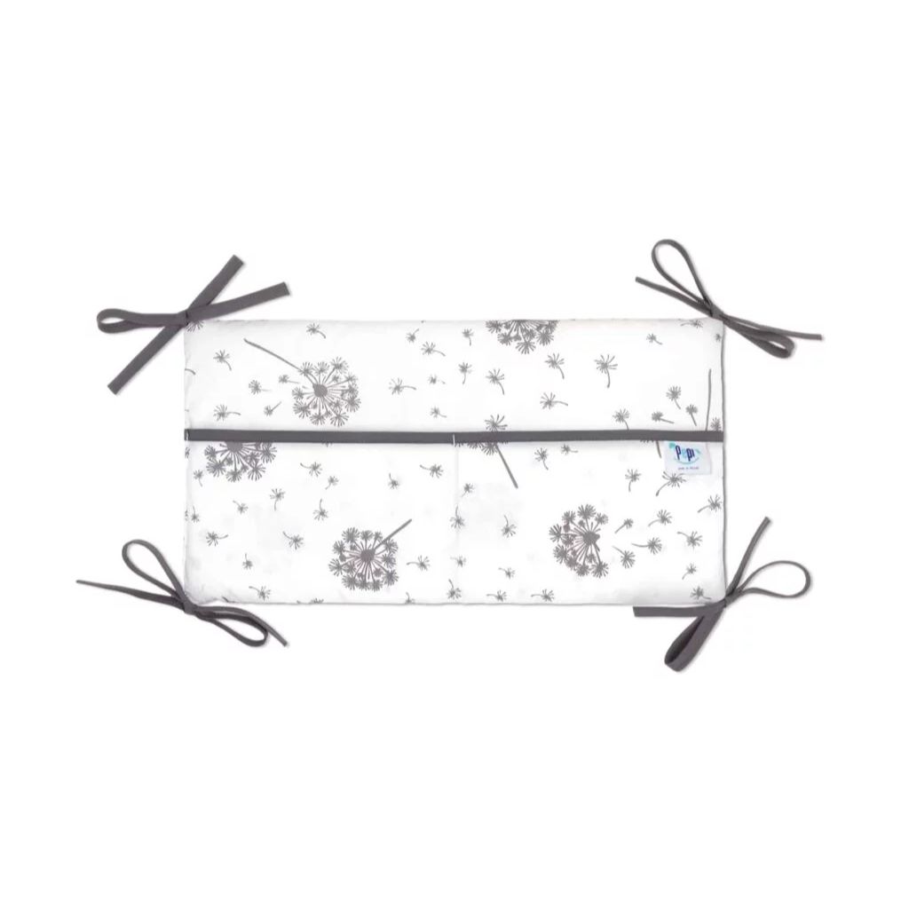 Náš organizér je vybaven pěti kapsami, které jsou navíc zesíleny ozdobnou lemovkou. Má také dostatečně dlouhé šňůrky, které umožňují stabilní připevnění k postýlce. Výplň tvoří měkké, antialergické vlákno a je vyroben z nejkvalitnější bavlny.