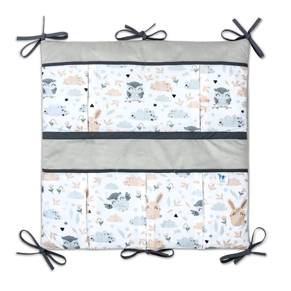 Náš organizér je vybaven pěti kapsami, které jsou navíc zesíleny ozdobnou lemovkou. Má také dostatečně dlouhé šňůrky, které umožňují stabilní připevnění k postýlce. Výplň tvoří měkké, antialergické vlákno a je vyroben z nejkvalitnější bavlny.