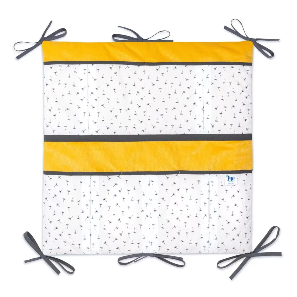 Náš organizér je vybaven pěti kapsami, které jsou navíc zesíleny ozdobnou lemovkou. Má také dostatečně dlouhé šňůrky, které umožňují stabilní připevnění k postýlce. Výplň tvoří měkké, antialergické vlákno a je vyroben z nejkvalitnější bavlny.