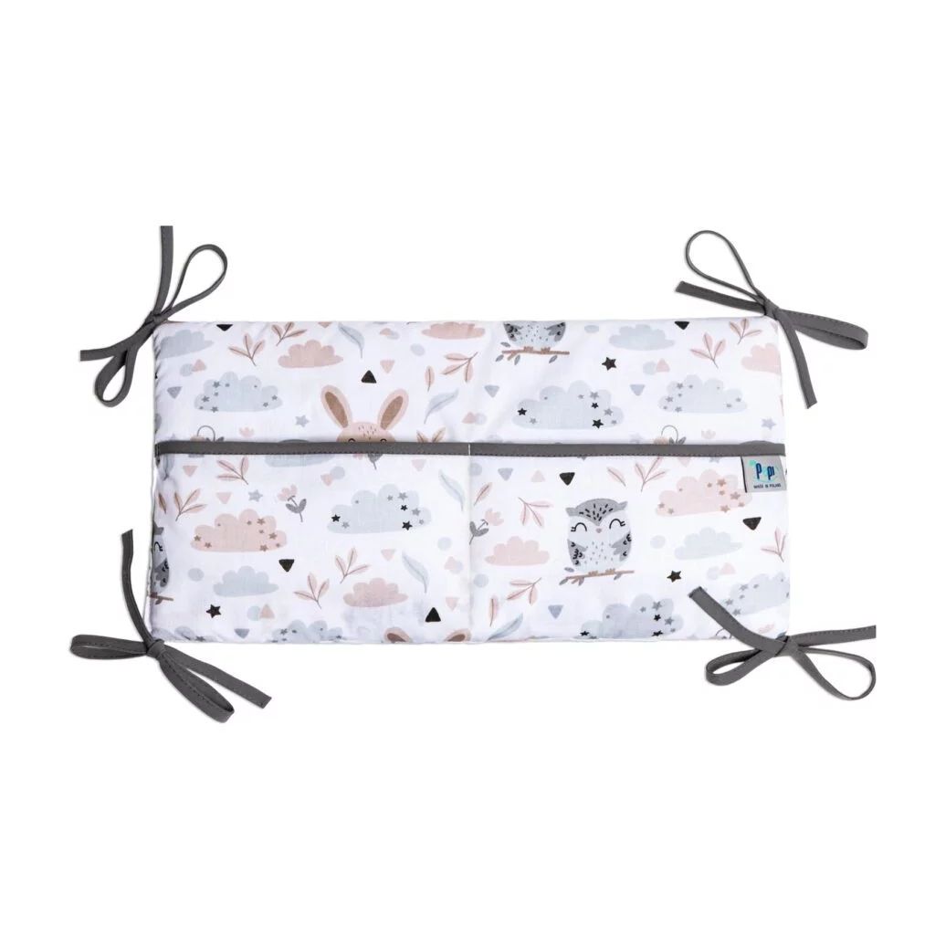 Náš organizér je vybaven pěti kapsami, které jsou navíc zesíleny ozdobnou lemovkou. Má také dostatečně dlouhé šňůrky, které umožňují stabilní připevnění k postýlce. Výplň tvoří měkké, antialergické vlákno a je vyroben z nejkvalitnější bavlny.
