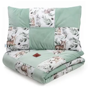 Vyrobena z jemné bavlny a měkkého velvetu, deka s polštářem poskytuje dítěti maximální pohodlí. Výplň z antialergických vláken je bezpečná pro citlivou pokožku dítěte. Náš set se postará o optimální regulaci teploty, což z něj činí ideální volbu po celý rok – jak pro teplejší, tak chladnější noci.