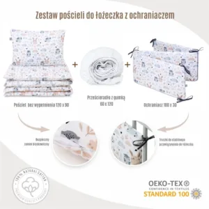 Mantinel chrání jemnou pokožku dítěte před náhodnými nárazy do boků postýlky, čímž vytváří bezpečný prostor pro odpočinek.