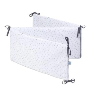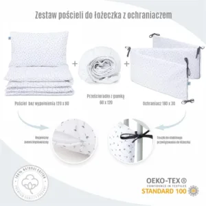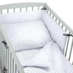Mantinel chrání jemnou pokožku dítěte před náhodnými nárazy do boků postýlky, čímž vytváří bezpečný prostor pro odpočinek.