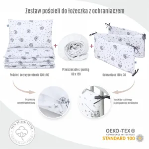 Mantinel chrání jemnou pokožku dítěte před náhodnými nárazy do boků postýlky, čímž vytváří bezpečný prostor pro odpočinek.