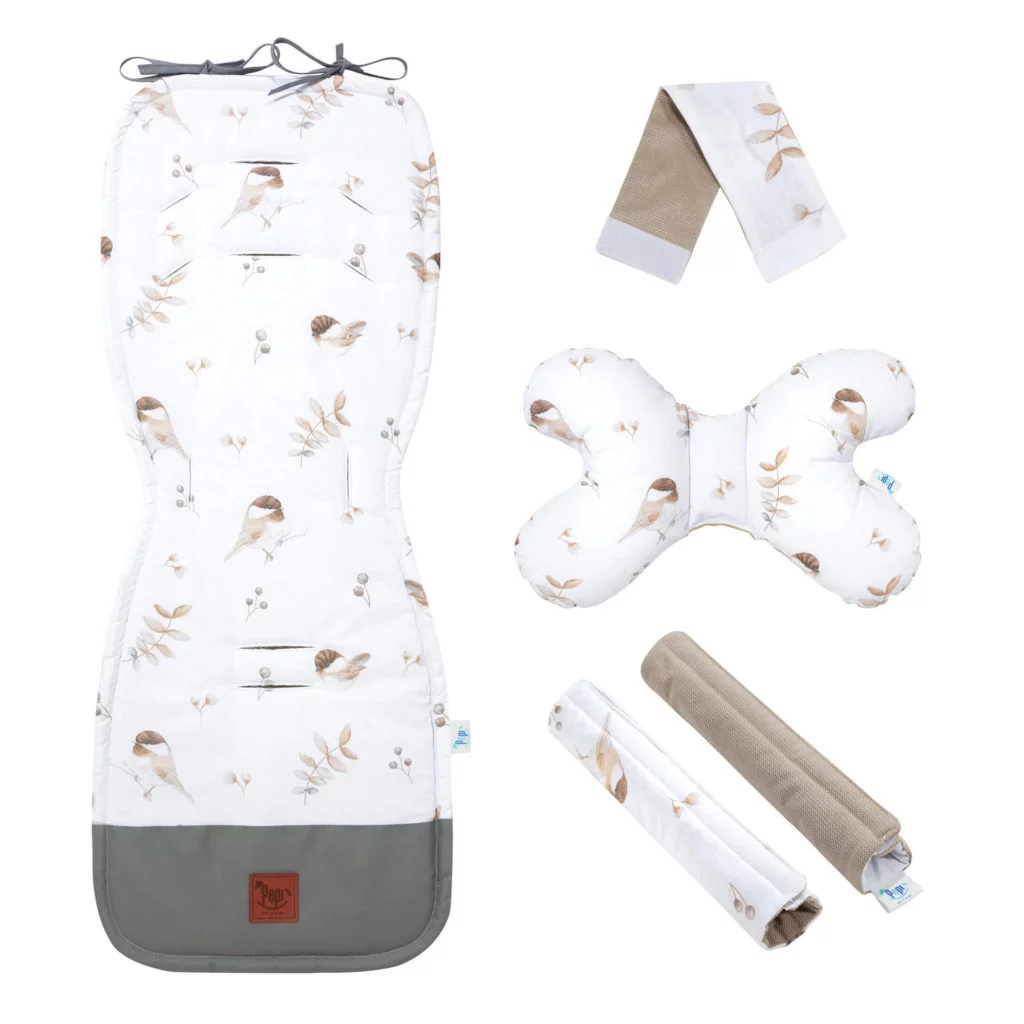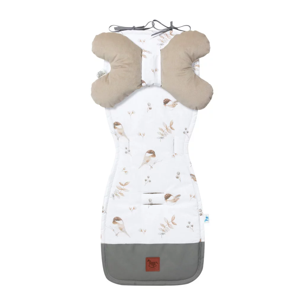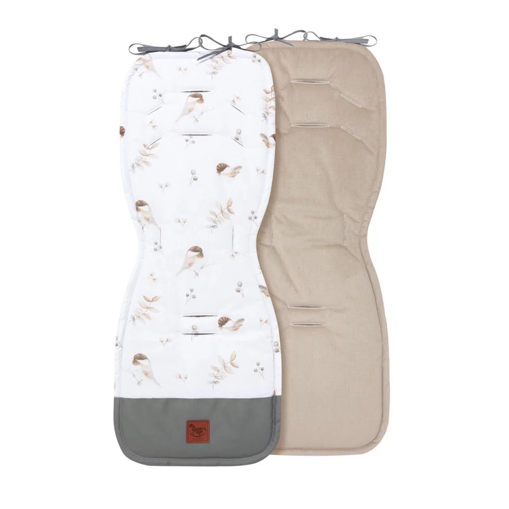Oboustranná vložka je nepostradatelným doplňkem pro náročné maminky a jejich maličké. Má 6 otvorů na bezpečnostní pásy, což zajišťuje, že se hodí do většiny sportovních kočárků a autosedaček typu kolébka. Všité šňůrky umožňují připevnění vložky k rámu kočárku, což zabraňuje jejímu posouvání.