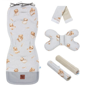 Sada se skládá z oboustranné vložky do kočárku, polštáře MOTÝLEK, pásky na suchý zip a dvou chráničů na pásy.