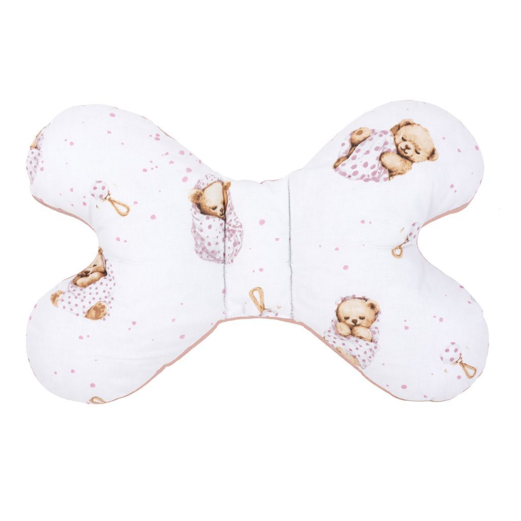 Polštář motýlek má speciálně navržený tvar, který podporuje přirozenou polohu hlavičky dítěte, zabraňuje jejímu nekontrolovanému pohybu a možným drobným úrazům.