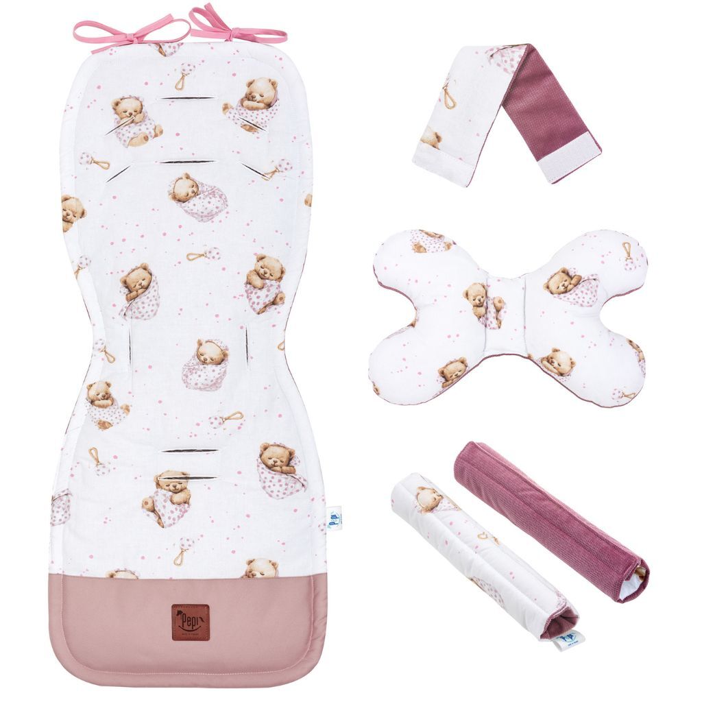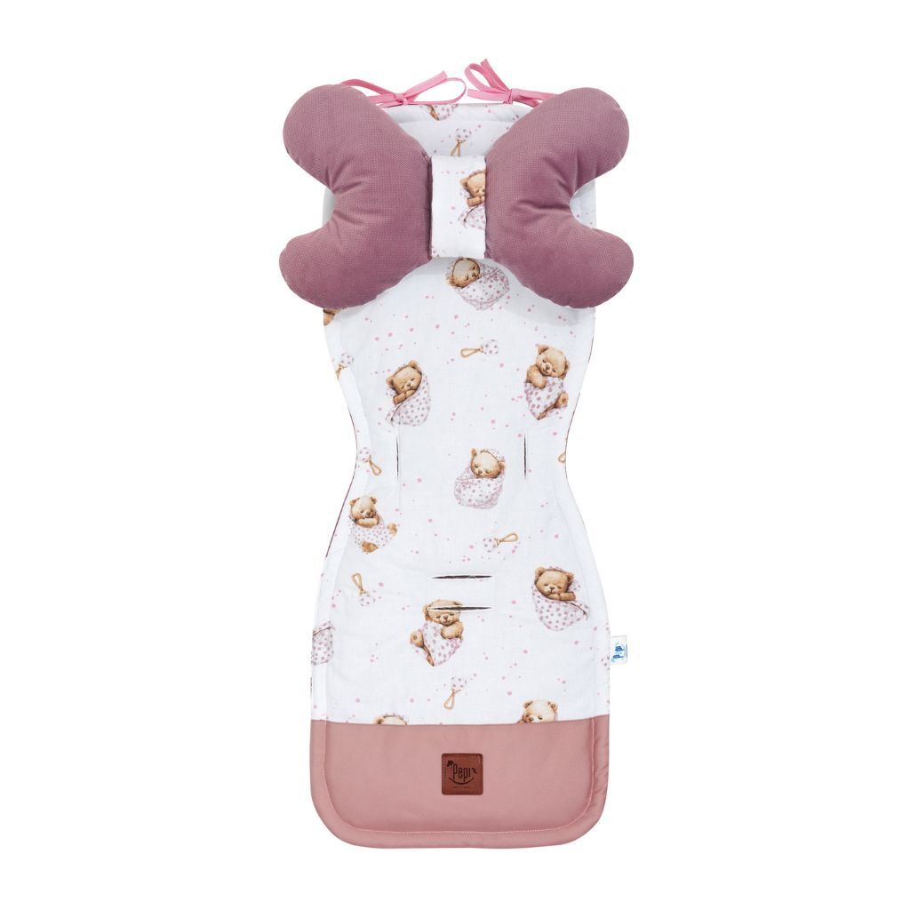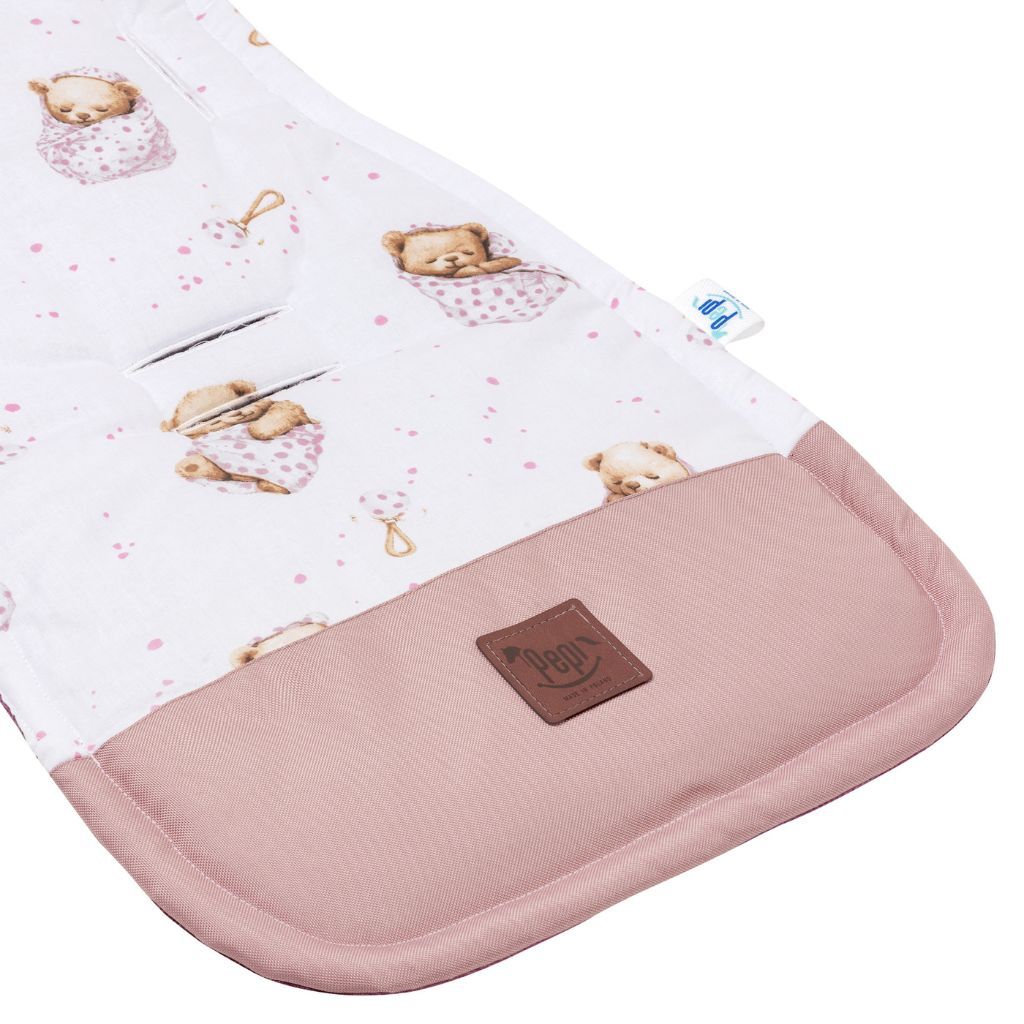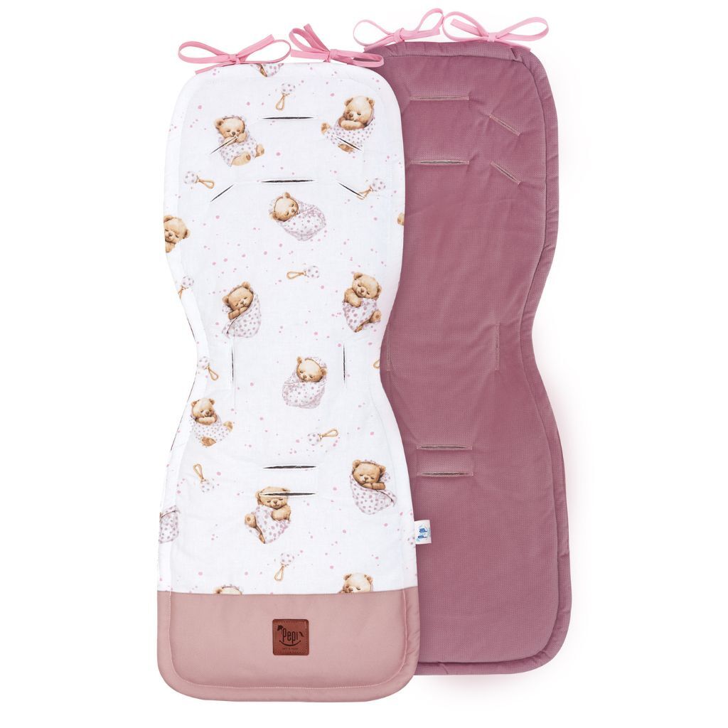 Oboustranná vložka je nepostradatelným doplňkem pro náročné maminky a jejich maličké. Má 6 otvorů na bezpečnostní pásy, což zajišťuje, že se hodí do většiny sportovních kočárků a autosedaček typu kolébka. Všité šňůrky umožňují připevnění vložky k rámu kočárku, což zabraňuje jejímu posouvání.