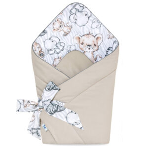 Zavinovačka se snadno přizpůsobí velikosti dítěte pomocí šňůrek, což zaručuje regulaci stupně zavinutí. Toto bezpečné a pohodlné zapínání eliminuje tvrdou sponu nebo suchý zip, které by mohly podráždit jemnou pokožku dítěte. Navíc zavinovačka usnadňuje krmení a nošení miminka, a po rozepnutí může sloužit jako dečka nebo hrací podložka.