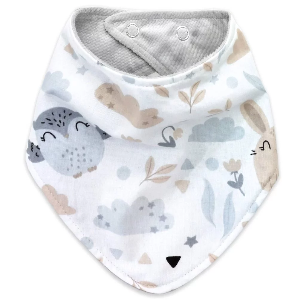 Vyrobený z nejkvalitnějších materiálů – měkké 100% bavlny a jemného velvetu, poskytujícího příjemný pocit na pokožce. Zapínání na pohodlné patentky zajišťuje stabilitu a jistotu, že nesklouzne z krku děťátka.