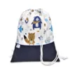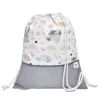 Horní část vaku je vyrobena z prodyšné bavlny, což zajišťuje správnou cirkulaci vzduchu a chrání obsah před vlhkostí. Spodní část vaku je ušita z odolného, voděodolného materiálu, který poskytuje ochranu před znečištěním a vlhkostí. Vak se stahuje bavlněnou šňůrkou s možností nastavení, takže si ho dítě může pohodlně nosit na zádech.