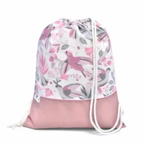 Horní část vaku je vyrobena z prodyšné bavlny, což zajišťuje správnou cirkulaci vzduchu a chrání obsah před vlhkostí. Spodní část vaku je ušita z odolného, voděodolného materiálu, který poskytuje ochranu před znečištěním a vlhkostí. Vak se stahuje bavlněnou šňůrkou s možností nastavení, takže si ho dítě může pohodlně nosit na zádech.