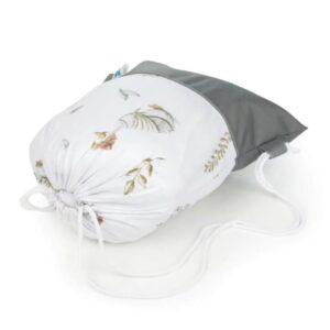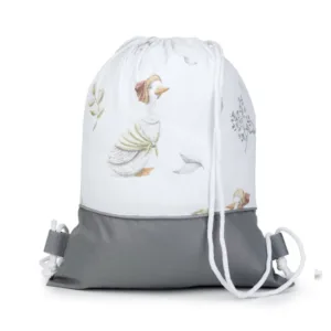Horní část vaku je vyrobena z prodyšné bavlny, což zajišťuje správnou cirkulaci vzduchu a chrání obsah před vlhkostí. Spodní část vaku je ušita z odolného, voděodolného materiálu, který poskytuje ochranu před znečištěním a vlhkostí. Vak se stahuje bavlněnou šňůrkou s možností nastavení, takže si ho dítě může pohodlně nosit na zádech.