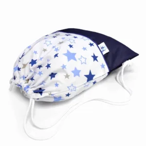 Horní část vaku je vyrobena z prodyšné bavlny, což zajišťuje správnou cirkulaci vzduchu a chrání obsah před vlhkostí. Spodní část vaku je ušita z odolného, voděodolného materiálu, který poskytuje ochranu před znečištěním a vlhkostí. Vak se stahuje bavlněnou šňůrkou s možností nastavení, takže si ho dítě může pohodlně nosit na zádech.