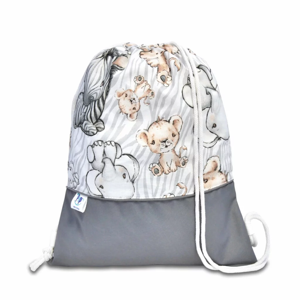 Horní část vaku je vyrobena z prodyšné bavlny, což zajišťuje správnou cirkulaci vzduchu a chrání obsah před vlhkostí. Spodní část vaku je ušita z odolného, voděodolného materiálu, který poskytuje ochranu před znečištěním a vlhkostí. Vak se stahuje bavlněnou šňůrkou s možností nastavení, takže si ho dítě může pohodlně nosit na zádech.