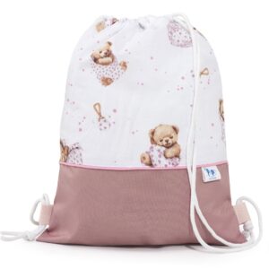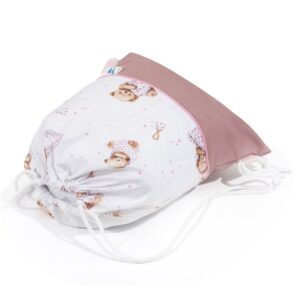 Horní část vaku je vyrobena z prodyšné bavlny, což zajišťuje správnou cirkulaci vzduchu a chrání obsah před vlhkostí. Spodní část vaku je ušita z odolného, voděodolného materiálu, který poskytuje ochranu před znečištěním a vlhkostí. Vak se stahuje bavlněnou šňůrkou s možností nastavení, takže si ho dítě může pohodlně nosit na zádech.