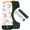 Nepropustná opěrka nohou z voděodolné tkaniny zabraňuje znečištění od mokrých bot, což usnadňuje péči o vložku. Chrániče na pásy zajišťují dodatečný komfort a bezpečnost během cestování, a jejich univerzálnost je ideální pro různé typy kočárků a autosedaček. Díky použití oboustranné látky a pohodlných suchých zipů jsou snadno montovatelné a použitelné.