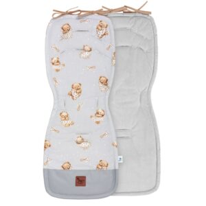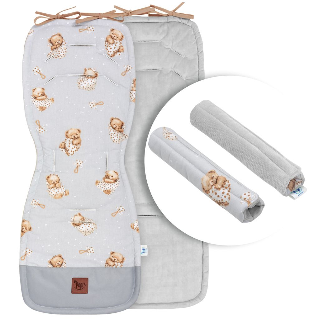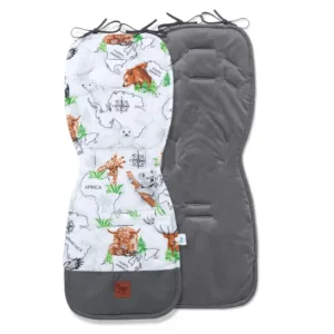Oboustranná vložka je nezbytným doplňkem pro náročné maminky a jejich děti. Má 6 otvorů na bezpečnostní pásy, což umožňuje použití s většinou sportovních kočárků a autosedaček typu kolébka. Připevněné šňůrky umožňují upevnění vložky ke konstrukci kočárku, což zabraňuje jejímu posouvání.
