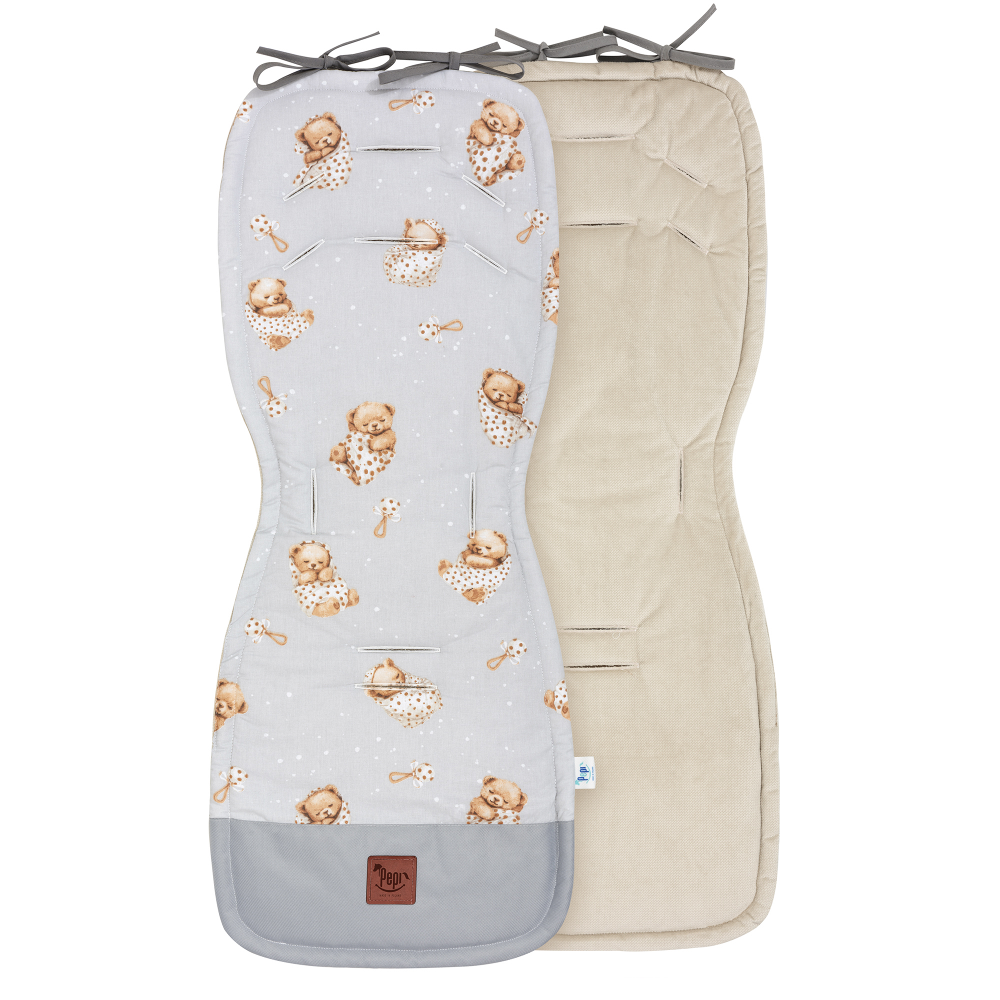 Oboustranná vložka je nepostradatelným doplňkem pro náročné maminky a jejich maličké. Má 6 otvorů na bezpečnostní pásy, což zajišťuje, že se hodí do většiny sportovních kočárků a autosedaček typu kolébka. Všité šňůrky umožňují připevnění vložky k rámu kočárku, což zabraňuje jejímu posouvání.