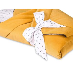 Zavinovačka je vázána pomocí jemné stuhy, což umožňuje její přizpůsobení velikosti dítěte a regulaci míry zabalení. Je to bezpečné a pohodlné zapínání, které vylučuje použití tvrdých prvků, jako jsou suché zipy, které by mohly podráždit citlivou dětskou pokožku.